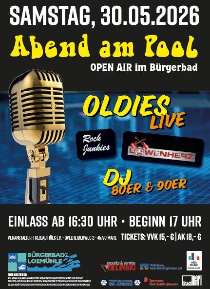 Die Party steht. Die Künstler proben bereits für die Auftritte. Für Stimmung sorgenDJ Guido KZeitflugDani Lynn Canto und Marco Kloss Einlass ab 15:30 Uhr Kartenvorverkauf 18 Euro/PersonAbendkasse 22 Euro/Person Kartenvorverkaufstellen: – Bürgerbad an der Loemühle,Sa von 10.00 – 13.00 Uhr– i-Punkt Marler Stern (plus VVK-Gebühr)Mo – Fr 9.30 – 18 Uhr, Sa 9.30 – 13.00…